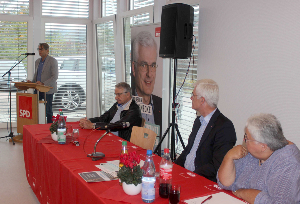 Das Präsidium des Parteitages lauscht den Worten von Thomas Schwarze (stehend) mit v.l.: Erstem Beigeordneten der Gemeinde Hauneck Georg Ruppel, SPD-Unterbezirksvorsitzendem und Landtagsabgeordnetem Torsten Warnecke sowie der SPD-Gemeindeverbandsvorsitzender Cornelia Ziehn. Bild: Thomas Giese (nh)