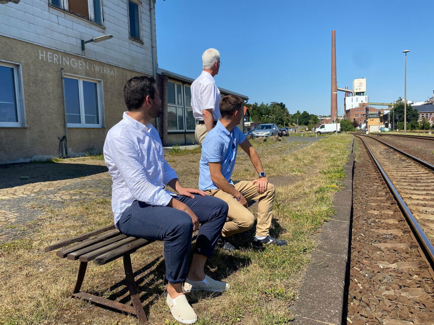 In der Mittagssonne schauen Heringens Bürgermeister Daniel Iliev sowie die Vorsitzenden der SPD-Unterbezirke Maik Klotzbach (Wartburgkreis) und Torsten Warnecke (Hersfeld-Rotenburg) im Bahnhof Heringen in Richtung Gerstungen auf den dereinst zu erwartenden ersten Personenzugnenzüge zwischen Gerstungen, Heringen und Vacha
