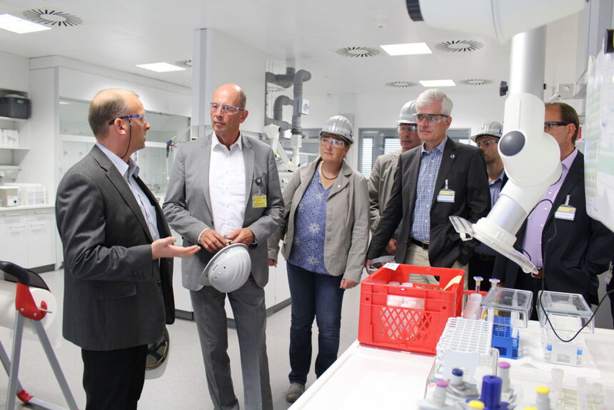 v.l.: Dr. Armin Dietrich (Leiter Analytic und Research Center) erläutert die Labortechnik Thüringens Wirtschafts- und Wissenschaftsminister Wolfgang Tiefensee, Monika Scheidt, Heringens Stadtverordnetenvorsteher Detlef Scheidt, Landtagsabgeordneten Torsten Warnecke, SPD-Wartburgkreis-Vorsitzenden Maik Klotzbach und verdeckt Unterbreizbachs Bürgermeister Roland Ernst.